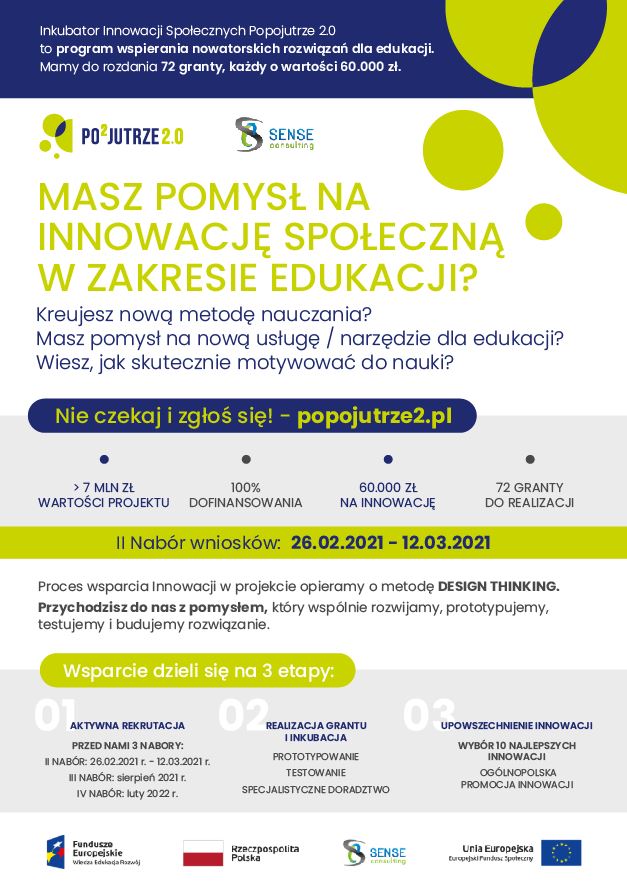 Jesteśmy przekonani, że projekt POPOJUTRZE 2.0 jest szansą dla wszystkich osób i instytucji, którzy widzą potrzebę zmian w obszarze kształcenia. Będziemy ogromnie wdzięczni za upowszechnienie informacji i zapraszamy do udziału!