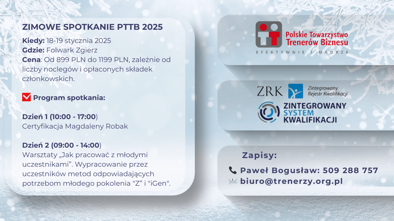 Podczas całego dnia będziesz mieć okazję doświadczania na czym polega postawa facylitatora clean, która tworzy bezpieczną, nieinwazyjną przestrzeń do zmiany i rozwoju. A wszystko to zrealizujemy w kontekście pytania o naszą rolę, jako trenerów i idealny proces szkoleniowy.